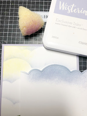 Here you can see the stencil for the clouds. I just laid it on the area I wanted to be clouds. With an inked sponge I ribbed from the stencil onto the cardstock keeping the ink close to the stencil. This helps create a shadow behind the cloud.