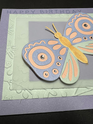 The sentiments and small butterfly are from the Life's a Hoot Cardmaking Workshop stamp set. Exclusive Inks used are Periwinkle and Peach. There is a layer of Vellum under the butterfly. This softens the colors in the background making the butterfly stand out a bit more.